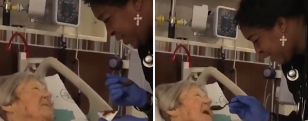 O momento foi compartilhado originalmente pela filha da idosa, que capturou a enfermeira entoando a canção com voz baixa e delicada enquanto ajuda a paciente a se alimentar.