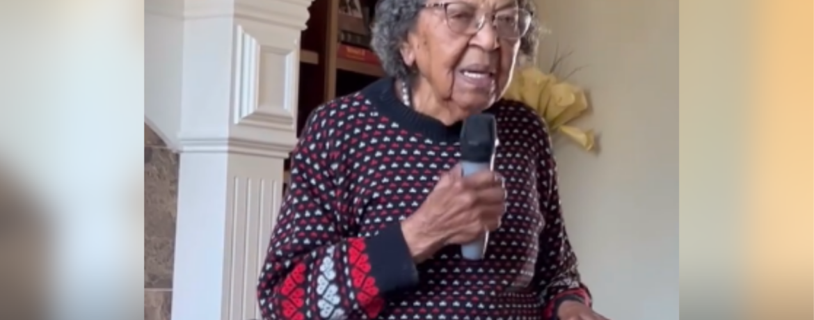 Uma idosa de 105 anos foi filmada pela neta, Sherese Conner, enquanto louvava a Deus com voz firme e ritmo marcado, junto à família e acompanhada por um órgão.