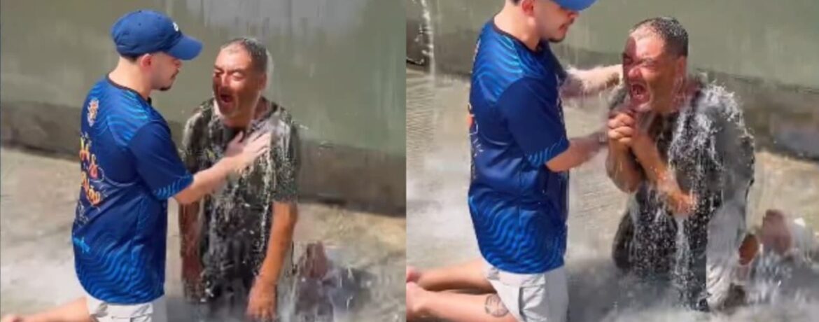“Eu entrego a minha vida a Ti, Papai”, disse o homem, muito emocionado. O evangelista orou por ele e declarou: “Eu te batizo no nome do Pai, do Filho e do Espírito Santo, amém!”.